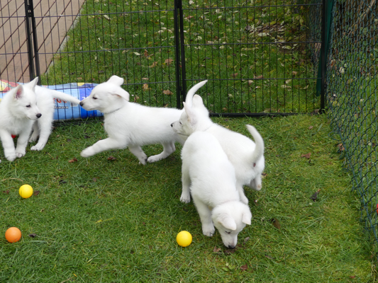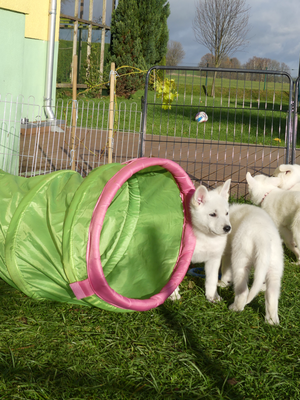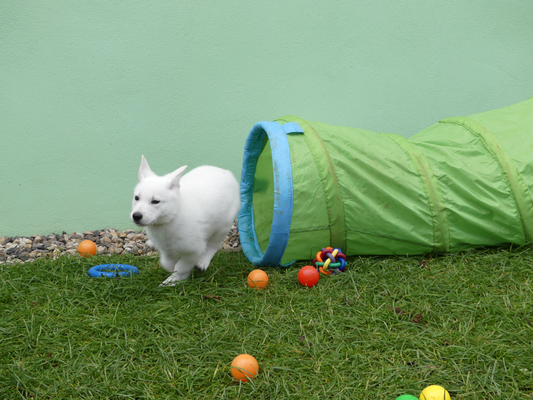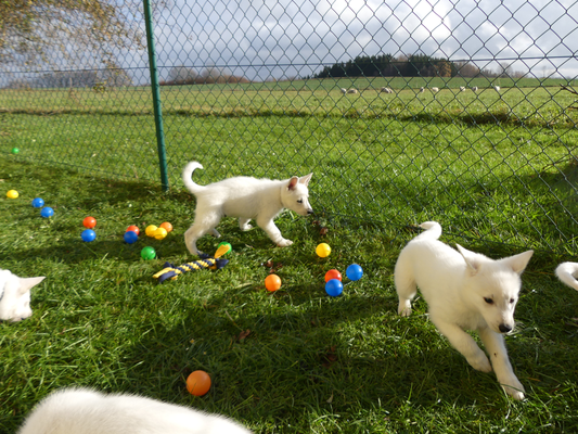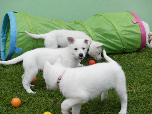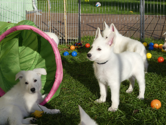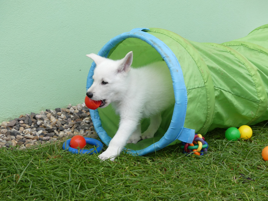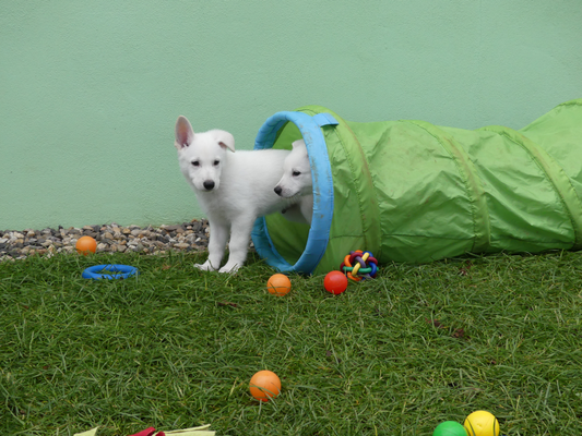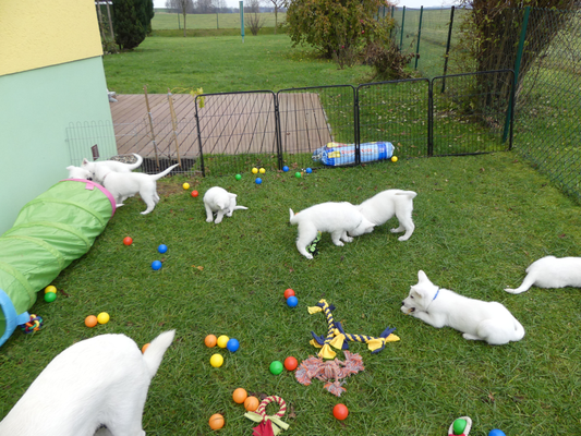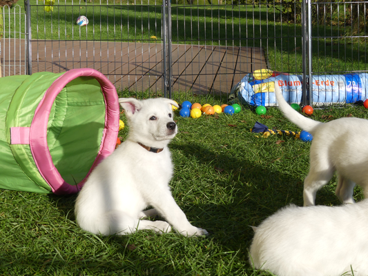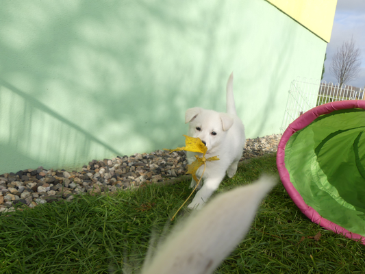 Endlich Sonne! Schnell alle Welpen hinaus! Die Kleinen hatten sehr viel zu erkunden und finden Blätter sehr toll, auch der Tunnel ist immer wieder der Hit. Monty sollte nun auch mal mit zu den