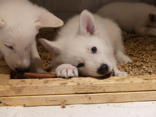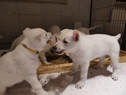 Und auch im Welpenzimmer gibt es immer viel Spaß und es wird genug Blödsinn angestellt - Sofa anknabbern, Mülldeckelsurfen, und Kloeinstreu buddeln :-)
