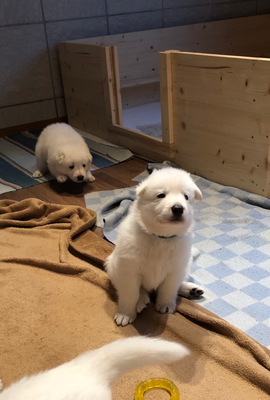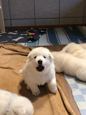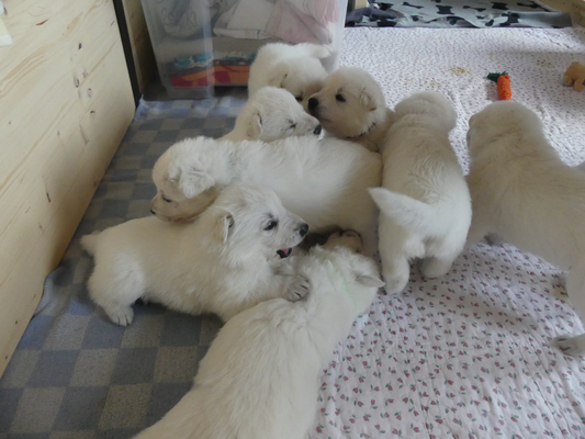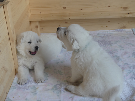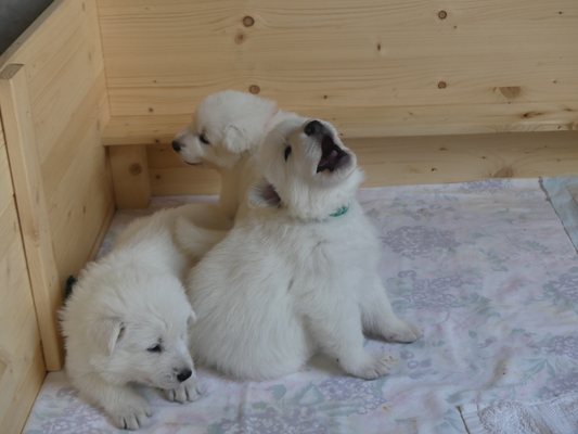 Es wird gebellt, gejault und versucht zu rennen, was meistens auf der Nase endet. Aber auch das kleine und große Geschäftchen wird jetzt allein ohne Mamas Hilfe gemacht. Das bedeutet, die Waschmaschine hat noch mehr zu tun und wir üben jetzt schon an der Sauberkeit der Welpen. Die Pipi-Matten werden teilweise sogar schon aufgesucht und für das richtige benutzt :-) manchmal auch zum spielen und kauen:-)