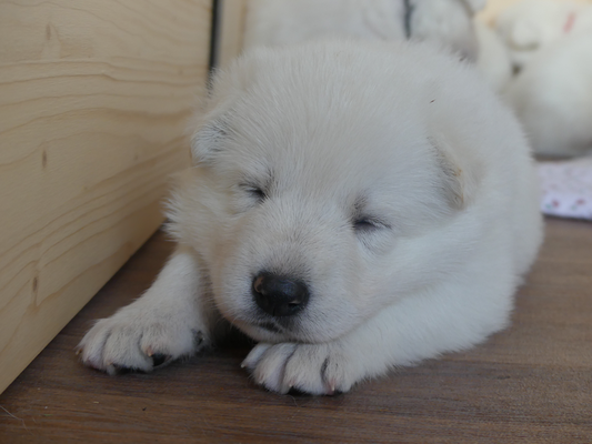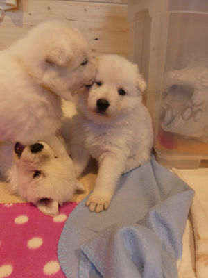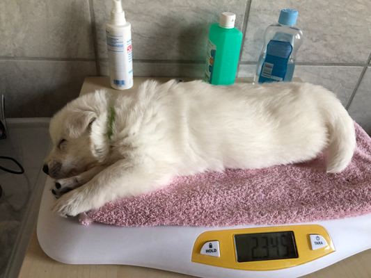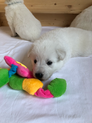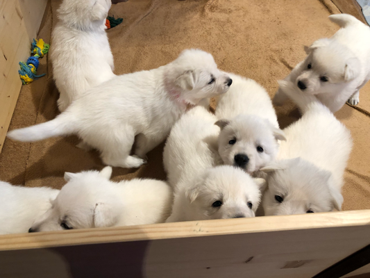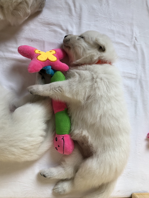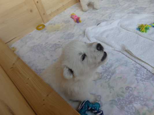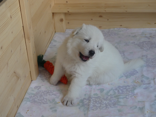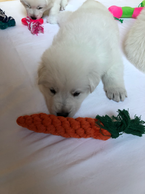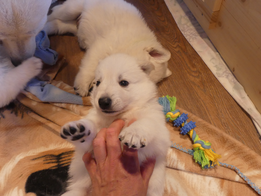 Und schon sind wir mitten in der Woche 4. Unsere Welpen entwickeln sich prächtig und alle sind sehr freundlich, neugierig und aufgeschlossen. Sie genießen die Kuscheleinheiten und spielen richtig schön miteinander aber auch mit den angebotenen Spielsachen. Besonders die Möhre hat es den Welpen angetan und teilweise wird das Ding schon rumgetragen :-)