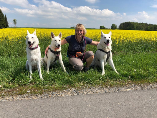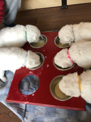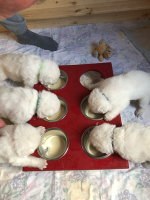 Die Welpenmilch wird so gern geschlabbert, dass wir wieder nachbestellen mussten. Elayne hat zwar noch gut Milch, aber für alle zum satt werden reicht es jetzt nicht mehr. Seit gestern gibt es auch eingeweichtes und püriertes Welpenfutter mit in die Milch und alle haben es gefuttert. Es geht auch mittlerweile gesittet an der Futterbar zu und es wird nicht mehr so gematscht. Meistens füttern wir in zwei Gruppen, Elayne säugt dann parallel mit und freut sich danach die Schüsselchen sauber zu lecken. Überhaupt ist Elayne eine super Mama, sie kümmert sich rührend um die kleine Bande und leckt, putzt und spielt mit ihnen. Aber auch im Rudel will sie wieder sein und auch der ein oder andere Spaziergang weckte Lust in ihr. Obwohl sie unsere Runden mit ihr allein noch mehr genießt.