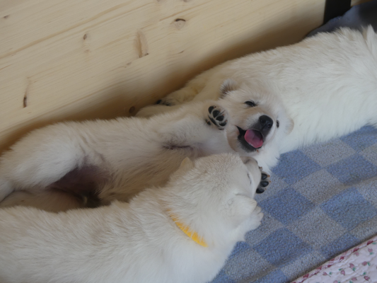 Monty und Aivy dürfen nur mal kurz um die Ecke schauen, bei Aivy ist Elayne entspannter, so dass Aivy bestimmt bald mal mit den Welpis spielen kann. Aivy ist auch ganz vorsichtig und ruhig wenn sie die kleinen Wusel sieht. Monty ist ja eh bissel genervt :-)